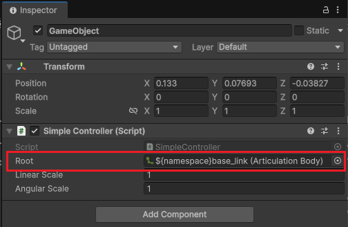 スクリプト作成後、作成した空のゲームオブジェクトのインスペクタを開き、Rootをbase-linkに紐づけます。